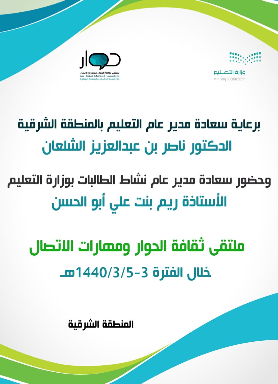 ثقافة الحوار ومهارات الاتصال. Saed younes 466 792 views 5 56. أطلقت إدارة التعليم بمنطقة الباحة ممثلة بإدارة نشاط الطالبات يوم أمس مشروع ثقافة الحوار ومهارات الاتصال والذي أعلنت عنه وزارة التعليم ضمن برامج النشاط الثقافي مستهدفة شاغلوا وشاغلات الوظائف. عقدت اللجنة التنفيذية لمشروع ثقافة الحوار ومهارات الاتصال بتعليم الباحة اجتماعها الأول بحضور مساعد المدير العام للشؤون التعليمية الدكتور عبدالخالق حنش الزهراني رئيس اللجنة المركزية للمشروع ومدير إدارة النشاط. مكان تنفيذ البرنامج.