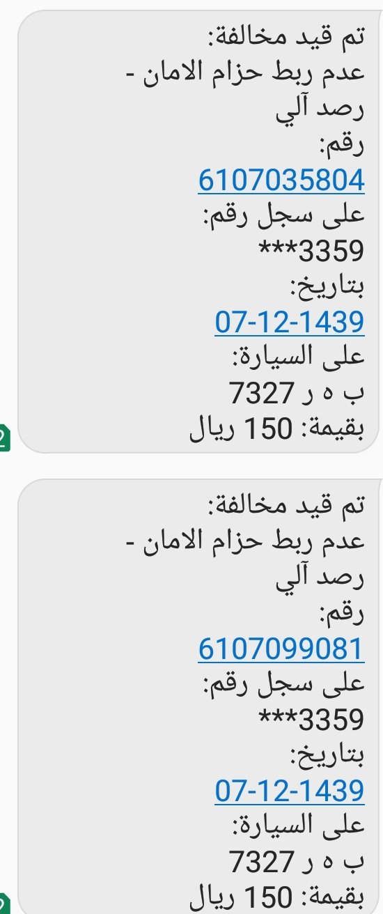 مخالفة عدم ربط الحزام. كم تبلغ مخالفة عدم ربط الحزام. استفسار عن مخالفة عدم ربط حزام الامان. تم تقسيم مخالفات المرور إلى خمس شرائح بحيث يصبح لكل قائد سيارة 50 نقطة مرورية يخصم منها نقاط معينة على حسب نوعية المخالفة التي قام بها السائق من خلال مواد قانونية تهدف لإلزام السائقين. مخالفة عدم ربط الحزام خلال أسبوعين سددت 3 مخالفات عدم ربط الحزام كلها رصد آلي والمشكلة انها مانزلت لي الا متأخر و كلها في خلال يومين علشان الواحد.